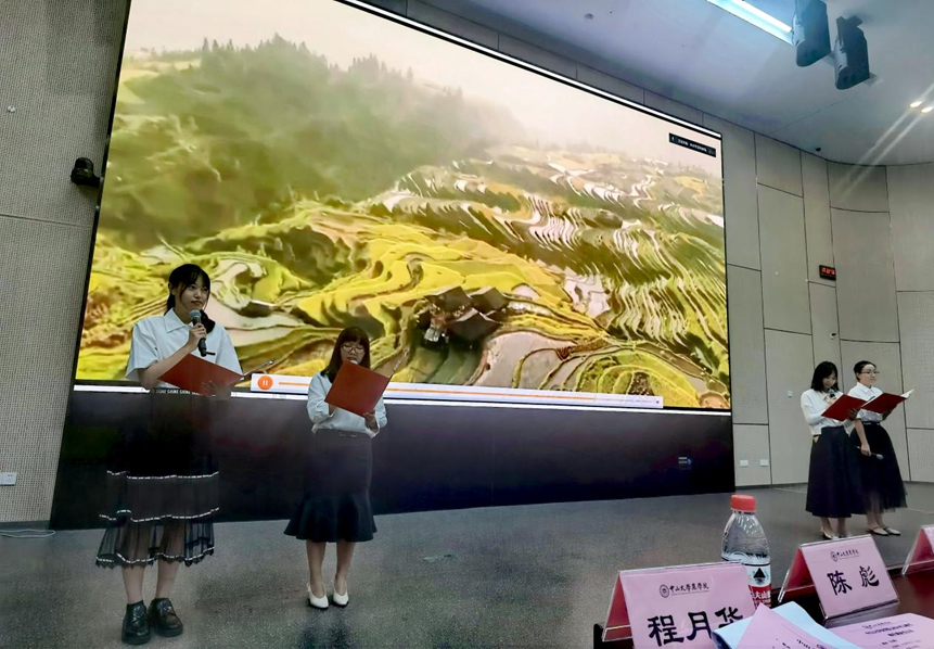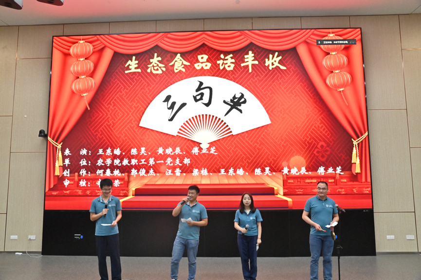 老师和同学们满怀激情、各展才艺:既有讲述血脉传承之情的歌曲《如愿》、表达人民丰收喜悦的舞蹈《舞动丰收》;又有以诙谐幽默方式展现农业发展新貌的三句半《生态食品话丰收》、赞美田园自然风情的歌曲《贝加尔湖畔》《风吹麦浪》;还有歌颂党领导农业人拼搏付出的诗朗诵《为了大地的丰收——农业人赞歌》,展现人民对美好生活向往的歌曲《知足》《好久不见》、乐器表演等等。最后,以从广州校区赶来的2023级本科新生董政恺同学一首《在希望的田野上》,落下了联欢演出的帷幕。