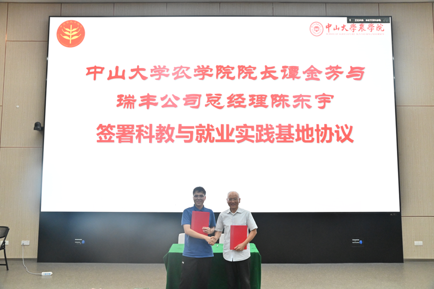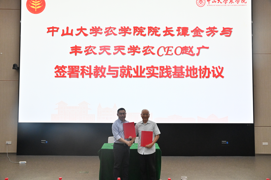 近两年,我院与深圳市丰农控股有限公司、广州瑞丰生态环境科技公司开展了务实合作,为人才培养、科研合作和社会服务拓展了平台。借助共庆丰收佳节之时,谭金芳院长代表学院,分别与丰农控股公司天天学农CEO赵广、瑞丰公司总经理陈东宇签署了科教与就业实践基地合作协议。
