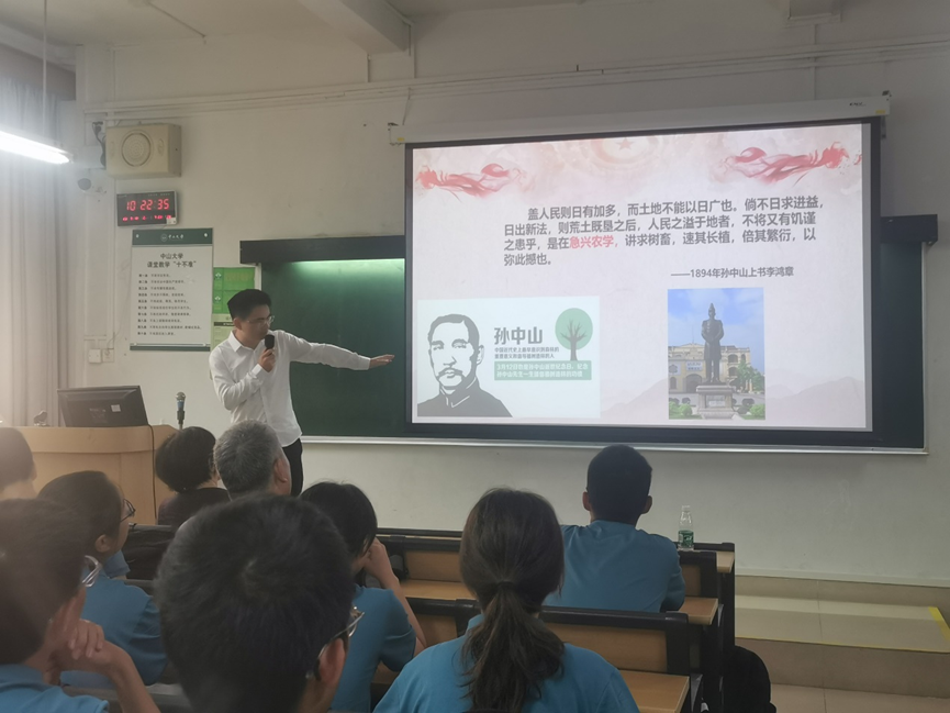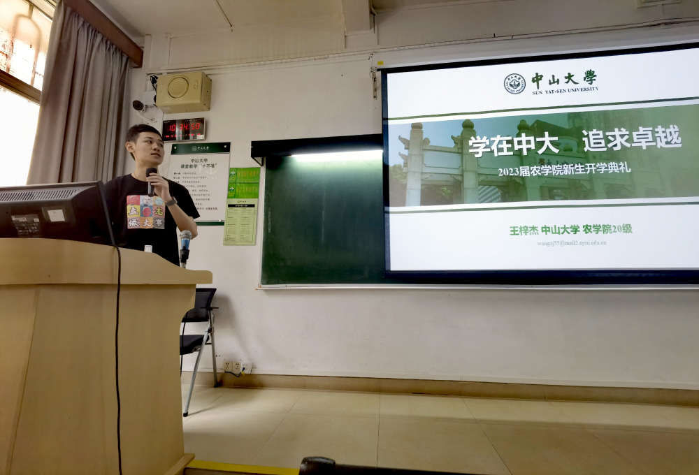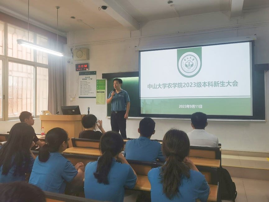 教师代表马克思主义学院青年教师专职辅导员黄越泓老师为新生做了思政教育,回顾了中山大学的红色发展史,帮助同学们从历史的角度认识农科发展对于中国,对于中山大学的重要意义。他勉励同学们独立思考、坚定信心,学好专业本领,为中国式农业现代化做出贡献。