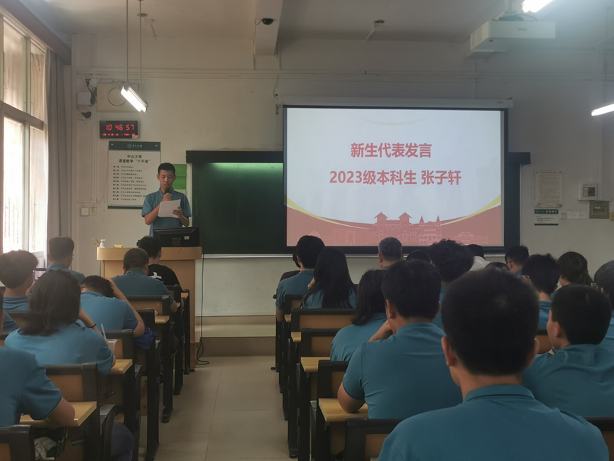 2020级本科生代表王梓杰同学在会上以“学在中大,追求卓越”为题,分享了自己在中大“学什么”、“怎么学”,以及如何“追求卓越”的体会。他以自身的成绩和体验,勉励新同学首先要学习学科基础知识,在专业方向上“扎好马步”;其次要学习自主探究的能力,积极参加专业竞赛,在团队中学会合作,共同进步,多在实验室、课题组中学习科研能力和创新能力。最后,他勉励学弟学妹以提高“学习力,思想力,行动力”为目标,学习责任与奉献精神,积极参加社会实践活动和志愿服务,在班级和学院的工作中主动担当,用行动为学院、学校和社会贡献青春力量。