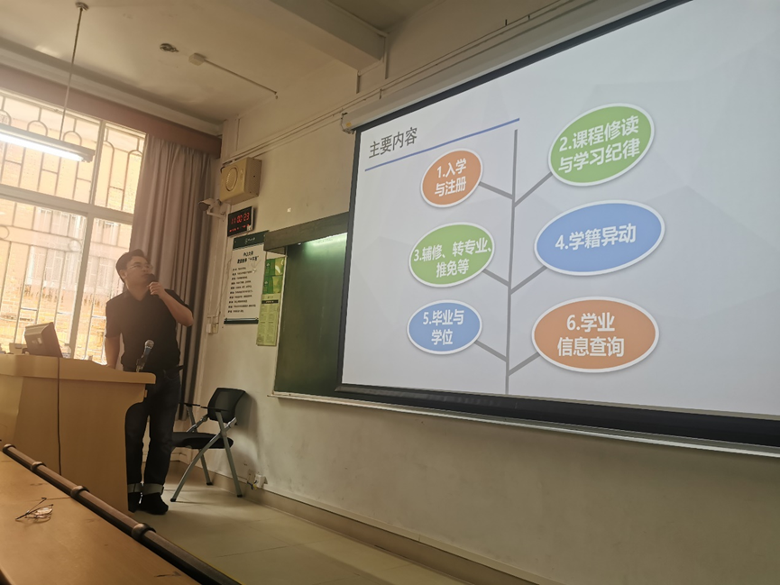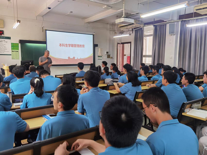 最后,在学籍管理教育环节,副院长辛国荣教授强调了在大学“学习”的重要性,进一步阐明了“学在中大,追求卓越”的深刻含义。他鼓励把大学四年时光尽量“花在图书馆里,花在实验室中”,努力提升自我,实现人生价值。