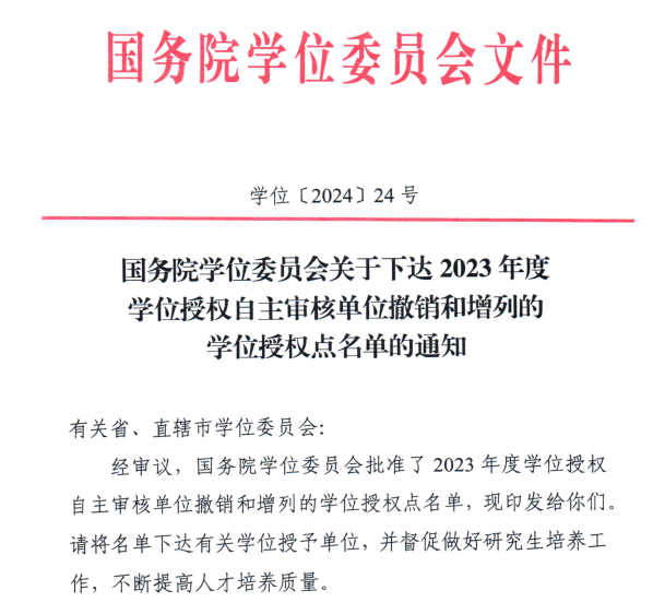 2024年9月30日,国务院学位委员会发布了《国务院学位委员会关于下达2023年度学位授权自主审核单位撤销和增列的学位授权点名单的通知》。