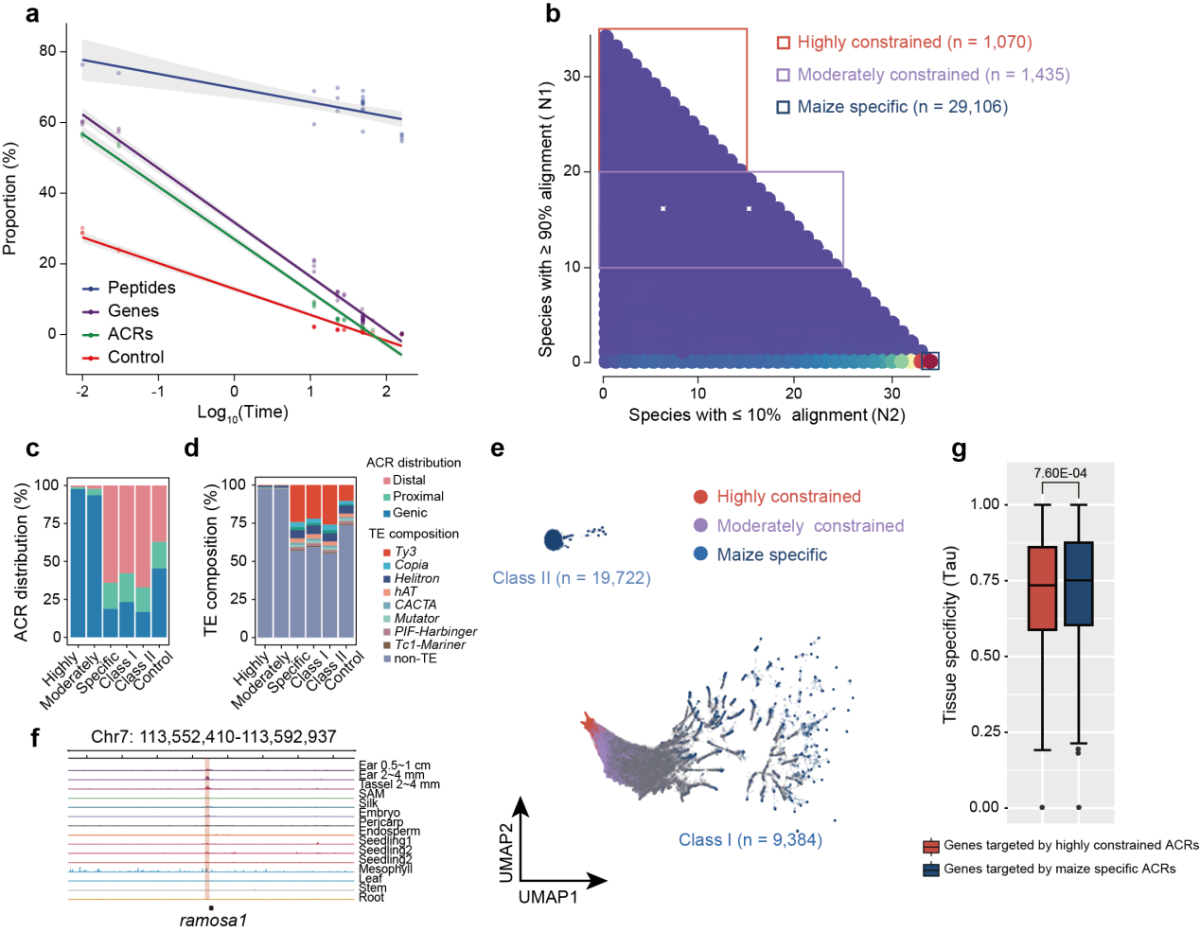 该研究构建了玉米B73自交系12个组织的ATAC-seq数据,鉴定到80365个染色质开放区(accessible chromatin regions, ACRs)。通过与禾本科34个物种高质量基因组的比较,发现玉米的ACRs明显的加速进化,导致约1/3的ACRs为玉米基因组特有(图1)。这些调控序列所靶向的基因功能显著富集在花器官发育等生物过程,且具有更高的组织表达特异性和更近的基因形成时间,暗示这些调控序列及基因可能参与了玉米物种特有的表型建成。