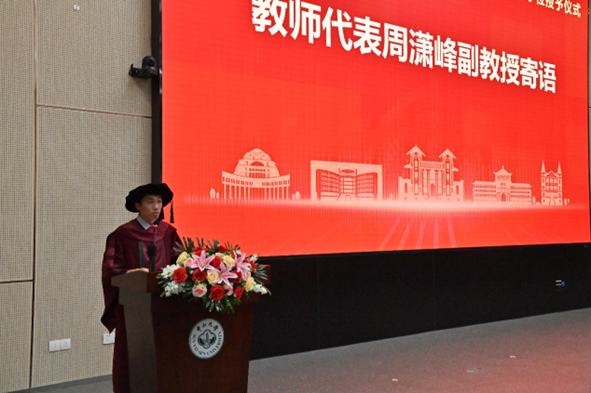 本科生毕业班2019级班主任、导师代表周潇峰副教授,代表导师为毕业生同学送上感言和寄语。周老师首先向所有毕业生同学们表示最衷心的祝贺和最诚挚的祝福,同时分享了自己结合学习、工作经历的一些思考与大家共勉,周老师强调,同学们要保持一颗乐观与感恩的心,要像勇敢的冒险家一样,敢于承担责任和风险,敢于面对挑战和不确定性,追求卓越,引领未来。