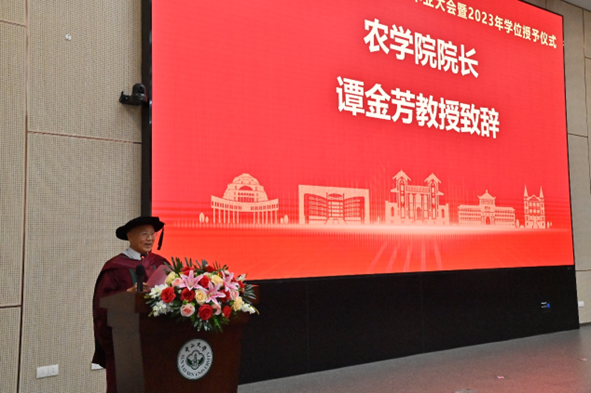 农学院院长谭金芳教授最后致辞,代表学院向全体毕业生表示热烈祝贺并致以诚挚祝福,庆贺毕业生们在中山大学启迪了思想、坚实了基础、汇集了智慧、凝聚了力量,为中国式农业现代化建设整装出发。接着,谭院长深情回顾了学院从零开始师生合力奔跑,一边建设一边管理一边倾力培养学生的历程。最后,谭院长祝贺各位毕业生“芝麻开花节节高”,学院是你们永远的家,老师们将在母校静等各位毕业生的佳音!