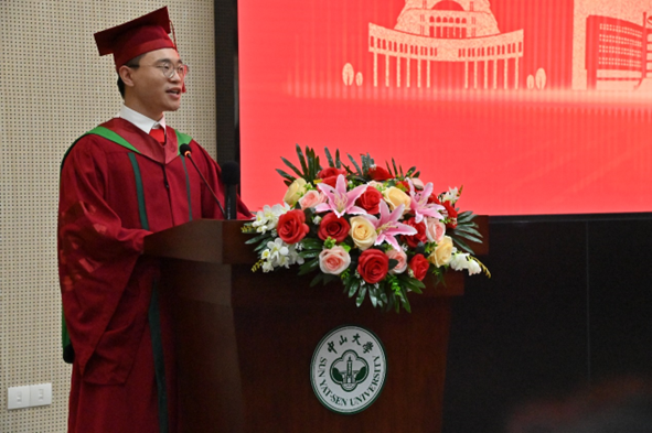 农学院博士学位获得者王健作为毕业研究生代表发言,他分享了自己在康乐园四载一次次克服失败、挫折和迷茫的宝贵经历,并向一丝不苟地指导、鼓励他的老师同学们表达最诚挚的谢意和衷心的祝愿。最后,王健表示:“新的社会环境需要我们担任新的角色、承担新的责任,我们不应该止步于此,而应保持一颗刨根问底的心,磨练自己,实现自我的提升。农学是一个不断进步和创新的领域,只有持续学习并紧跟农业科技的发展,我们才能为解决全球食品安全、提高农业生产效率以及保护生态环境做出更大的贡献。”