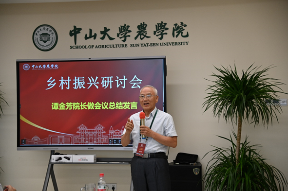 最后,谭金芳院长做总结发言。谭院长表示,本次研讨会非常成功、嘉宾代表们的分享报告都非常精彩,参会人员们在交流思想中发现问题、解决问题。对于抗战办学老区的代表们提出的问题和需求,学院将在会后进一步深入研究,充分发挥中大农学院的智力和人才优势,努力服务老区建设;同时,学院希望与相关政府部门、涉农高新企业进一步加强合作交流,促进产学研深度融合,推动服务乡村振兴的措施落地做细、取得实效。