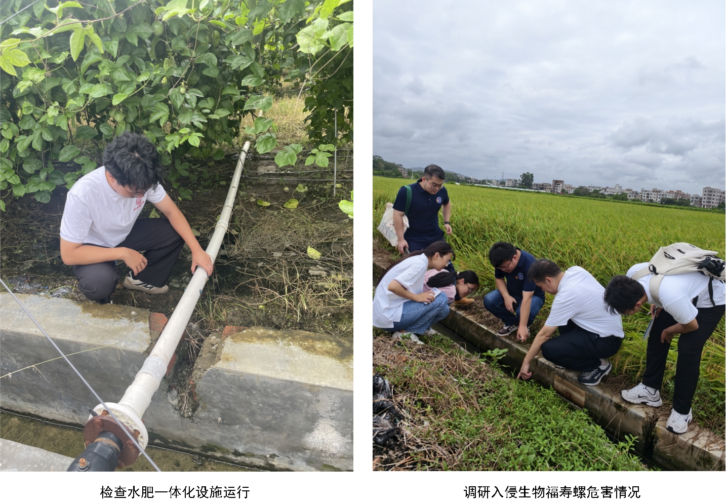 随后,队员们深入田间地头,实地考察各类作物种植、生长现状,及合作社生产基地水肥一体化设施运行情况。突击队对水稻害虫稻飞虱、入侵物种福寿螺的危害情况进行了专门分析。针对当地水稻大面积倒伏的现象,突击队的指导老师陈景光副教授与陈宝定博士指出,晒田期积水加剧与稻飞虱滋生是水稻倒伏、减产的主因。对此,突击队提出通过优化排水设施、加强病虫害监测与预警体系来提升水稻种植的抗病害、抗台风等自然灾害的抗逆能力的建议。针对稻飞虱危害问题,突击队建议在施用“叶蝉散”时,将适量煤油与细沙与之混合一同施入水稻根部区域,实现农药与载体的科学融合,提升防治效果。