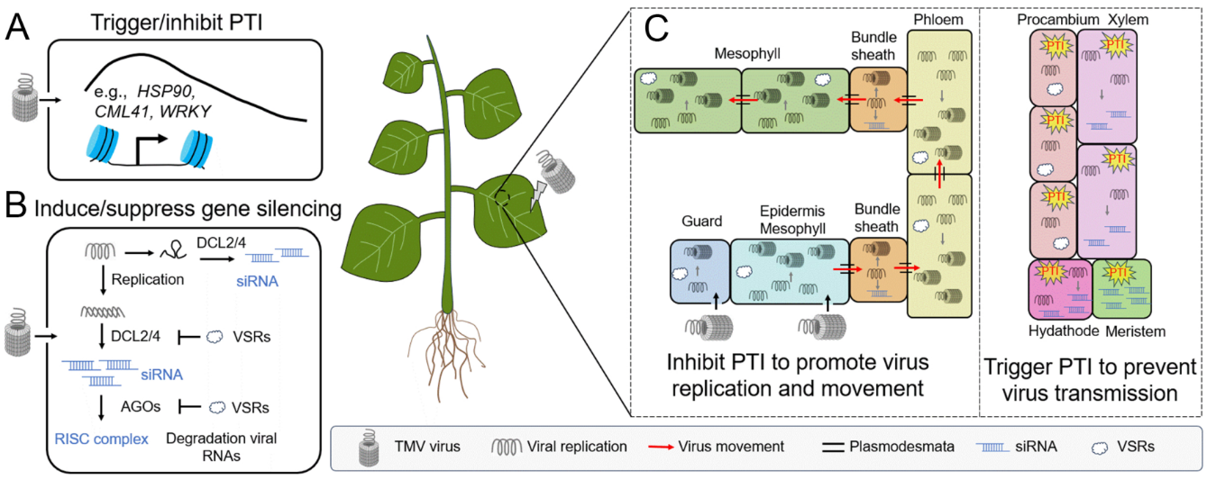 植物在自然界中不断受到各种病原体的挑战,显著影响植物的生理和生化过程,导致作物产量的大幅下降,从而威胁粮食安全。植物在防御病原体感染中进化出两层先天免疫系统,称为模式分子触发的免疫反应(PAMPs-triggered immunity, PTI)和效应因子触发的免疫反应(effector-triggered immunity, ETI)。植物通过对病原体微生物分泌PAMP的感知触发PTI反应,从而限制病原体微生物的生长繁殖。病毒作为细胞内的专性病原体,必须依赖宿主细胞进行繁殖和代谢,但在植物与病毒相互作用中,对于病毒侵染后植物如何触发PTI反应以抵御病毒入侵这一机制,人们的认知仍然十分有限。