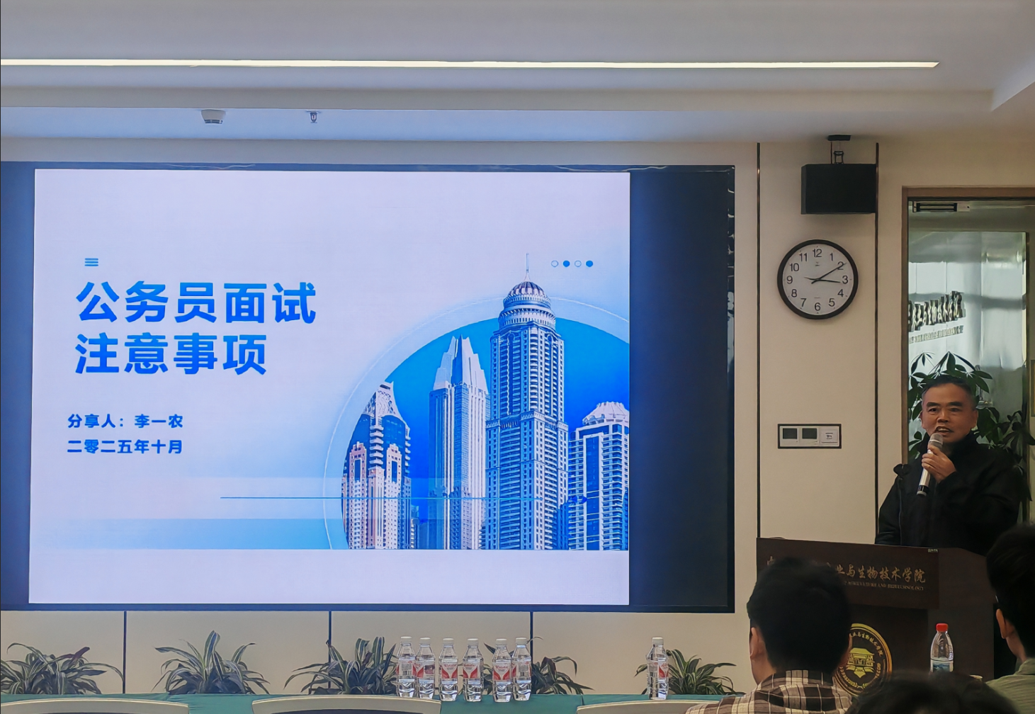 李一农研究员系统地介绍了公务员、事业单位等公职岗位面试的基本程序和考察要点,他结合实际案例,从面试前的心理准备、仪容仪表等细节,到面试答题时的逻辑、节奏、表达、时长等需要重点关注的部分一一进行了解析。李一农研究员鼓励大家,在当前全面推进社会主义现代化强国建设和农业强国建设的关键阶段,各级管理部门对于相关专业人才有着旺盛的需求,大家要充分发挥自己的专业优势,不断提升个人能力,积极匹配专业对口的岗位,实现个人成长与国家发展紧密融合。在随后的现场交流中,面对同学们 “面试答题失误如何应对”“公职岗位的发展前景”等疑问,李一农研究员给予了生动耐心的解答。另外,他特别强调了参加“模拟面试”对提升公职岗位面试能力的重要作用。