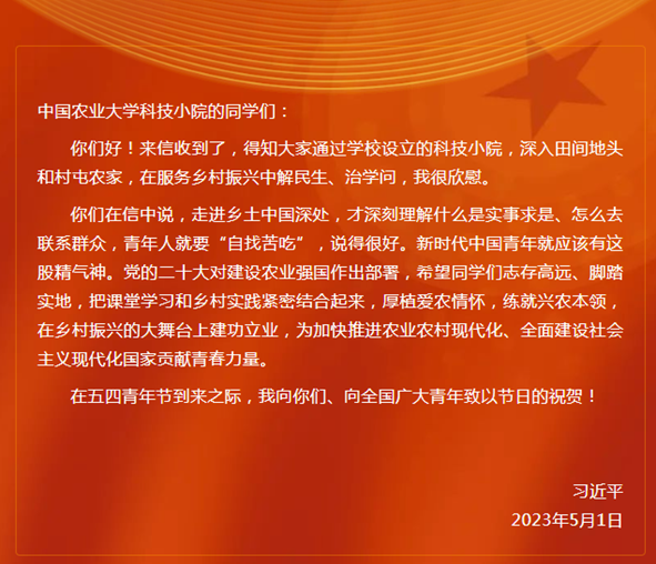 习近平总书记的回信,饱含着对青年学生特别是涉农学子的殷切期望。我们将牢记习近平总书记“厚植爱农情怀,练就兴农本领”的嘱托,以青年的热情,在田埂上书写青春故事;把课堂和实验室搬到乡野中去,从带去科技到全面改变乡村,在实践奋斗中展现青春风采。