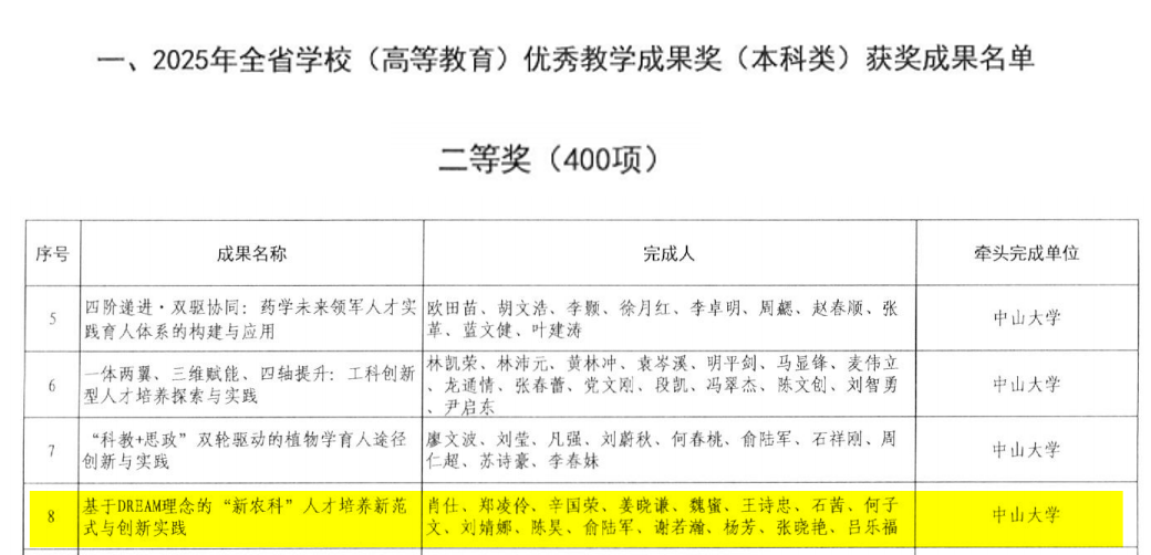 近日,广东省教育厅公布2025年全省学校优秀教学成果奖(高等教育)获奖成果名单,我院肖仕、郑凌伶、辛国荣等教师申报的成果“基于DREAM理念的‘新农科’人才培养新范式与创新实践”喜获广东省优秀教学成果奖(高等教育-本科类)二等奖。