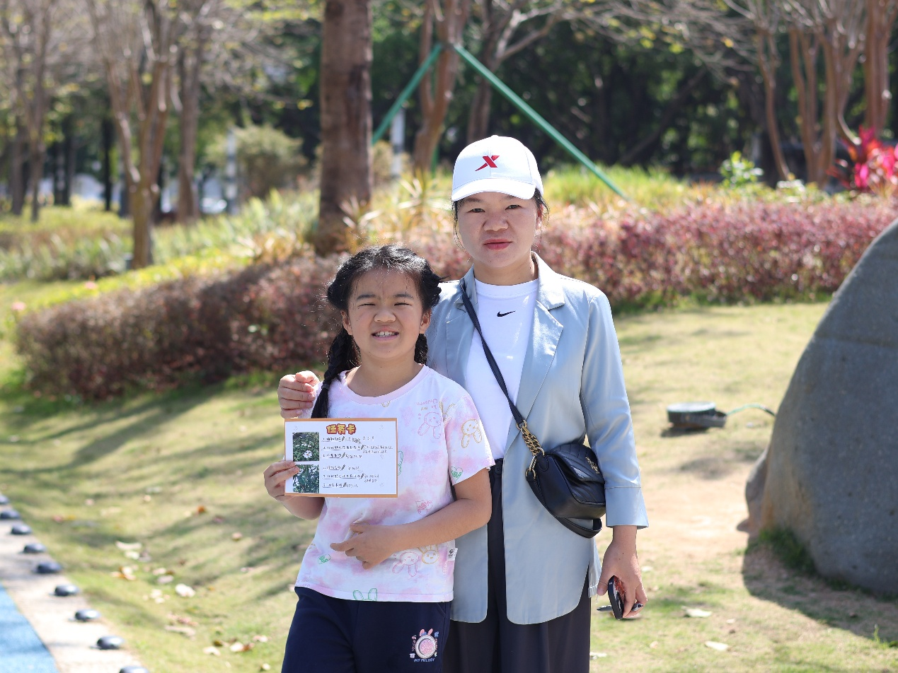 从室内走向户外,科普的课堂在天地间延展。志愿者带领亲子家庭走进国防教育主题公园,分发研学任务卡,开启了实地植物识别挑战。