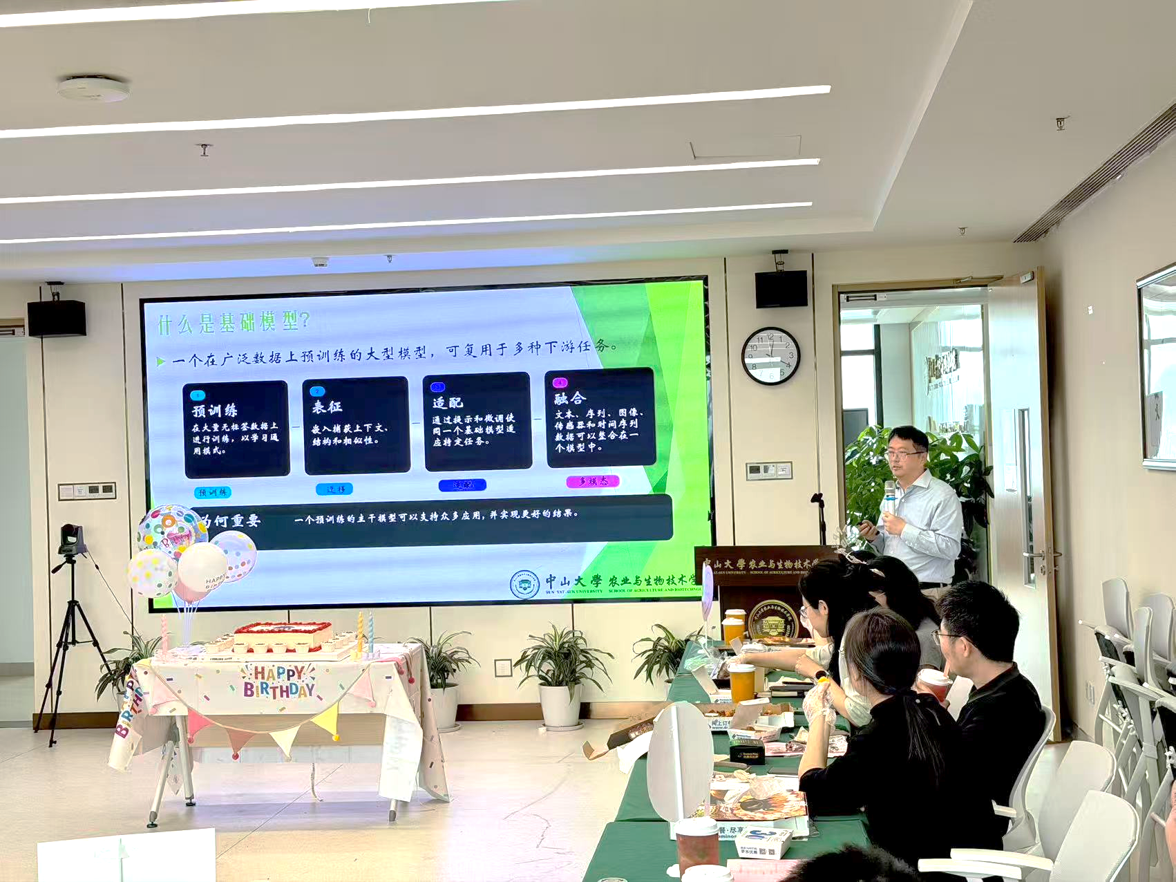随后的 “智汇” 学术环节成为本次生日会的亮点。罗峰教授围绕 “人工智能及其在生物和农业中的应用” 展开专题分享,结合前沿研究与学科发展,为老师们带来全新的学术视角。分享结束后的开放讨论与交流环节,大家踊跃发言、碰撞思想,在轻松的氛围中拓展了学术视野,凝聚了团队共识。