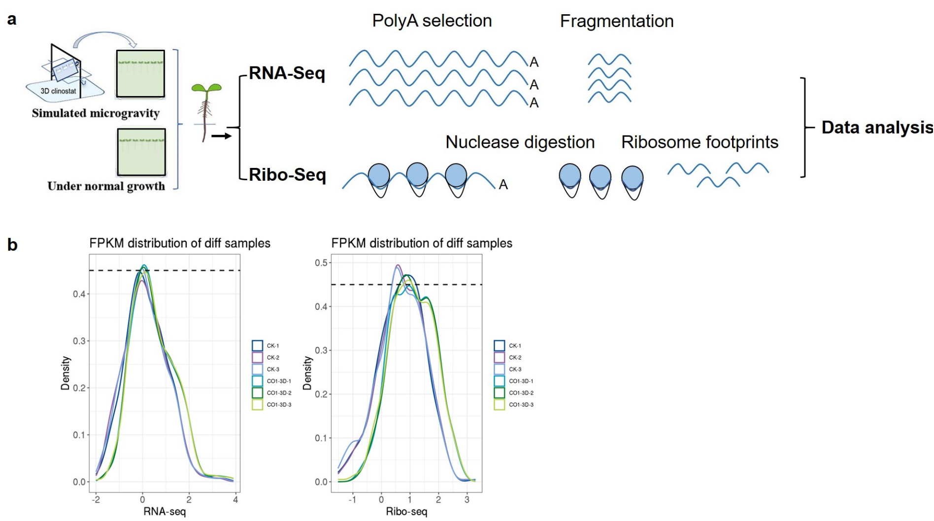 (a) 对 6 日龄 Col-0 拟南芥幼苗根系进行核糖体图谱分析(Ribo-seq)和转录组测序(RNA-seq),样本分为正常生长条件组和模拟微重力处理组。 (b) 核糖体图谱分析(Ribo-seq)和转录组测序(RNA-seq)数据的表达丰度分布。横坐标表示 log10 FPKM 值,虚线清晰区分对照组(CK)和 3D 回转处理组(Col-3D)的转录与翻译丰度。