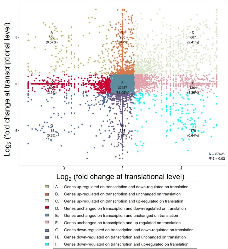图2. 模拟微重力条件下转录水平和翻译水平FPKM的倍数变化