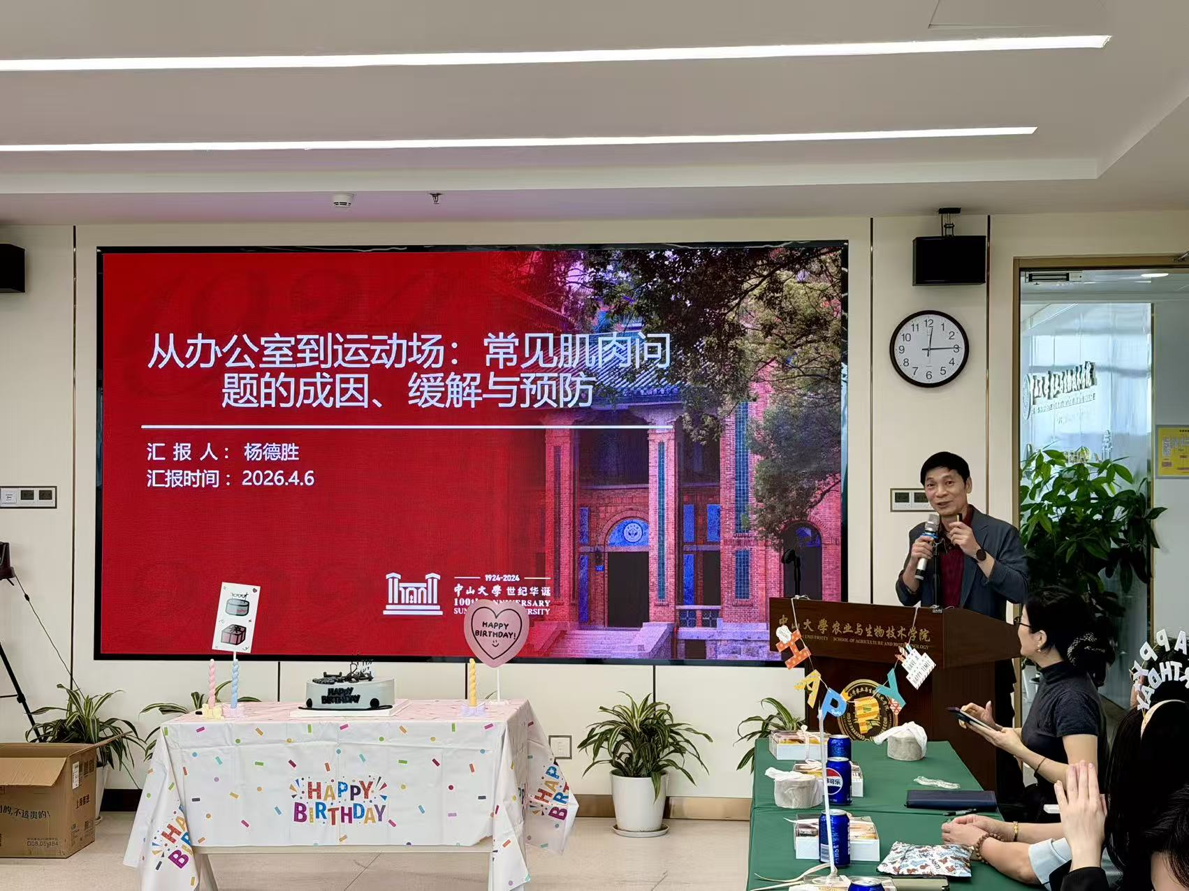 生日会上,学院党委书记杨德胜以《从办公室到运动场:常见肌肉问题的成因、缓解与预防》为题作主题分享。