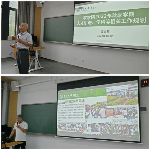 程书记简要通报了学院在上学期末特别是暑期里开展的青年教师授课大赛、全国大学生专业大赛指导、“科技小院”建设推进、师生云南凤庆“三下乡”服务、教职工党员台山红色教育与乡村振兴调研、国家第三次土壤普查广东试点外业采样等工作,邀请相关领导和老师进行分享交流。