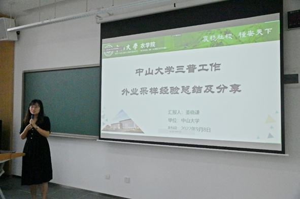 学院党委委员兼农业资源利用教研室副主任姜晓谦老师生动地介绍学院了学院师生在暑期里,响应国家需求,奔赴广东高州市开展全国第三次土壤普查( 简称“三普”)广东试点外采样工作的经历。大家秉承“服务国家,事业至上”的精神,统一标准、提前规划、边干边学、协同作战,顶着烈日酷暑、忍受蚊虫叮咬,翻山越岭、保质保量地完成了高州市184个点的土壤采样工作,在广东省9支队伍中第一个完成外业采样,得到广东省农业农村厅的充分肯定和同行专家的好评,并为全省做了中大“三普”工作经验分享。