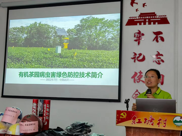 第二天(7月20日),学院一行对拟建设有机茶园的红塘村实地调研。林春鸿董事长结合武大绿洲公司的成功案例,给出了面源污染治理、有机肥料施用等系统的指导意见;程书记建议村干部借助中山大学农学、地理科学与规划等相关学院的专业优势,制定综合性、全方位的建设方案,科学合理、平稳长效地建设有机茶园示范基地,逐步有序推广。随后,在中山大学挂职干部、驻红塘村张良友书记的安排下,学院一行在村委会会议室举办了有机茶园科普讲座交流。陈娇主任介绍了有机茶园病虫害绿色防控实用技术,朱冠恒副教授针对茶树的天牛虫害给出了简便易行的绿色防控方法。学院一行深入浅出的技术讲座,不仅得到了村干部的高度重视,而且引发了村民们的互动交流。
