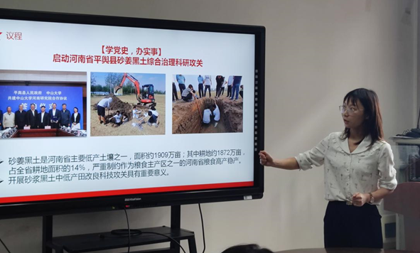 我院教工第二党支部宣传委员魏蜜老师以“学党史、办实事”为主题介绍了支部建设情况。通过深入农村基层调研,结合农学专业,为当地解决实际需求。党支部先后启动了河南省平舆县砂姜黑土综合治理科技攻关,与云南省凤庆县红塘村开展支部共建与技术帮扶等,这些工作正在党支部的带领下持续推进并取得阶段性结果。