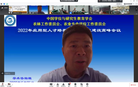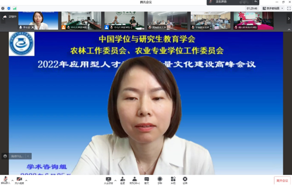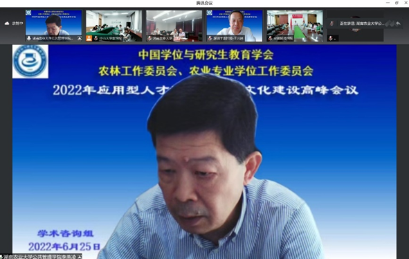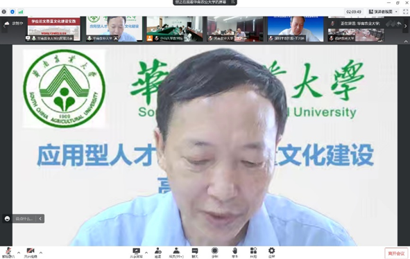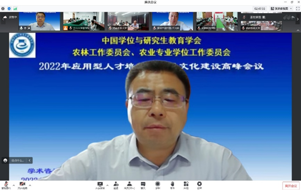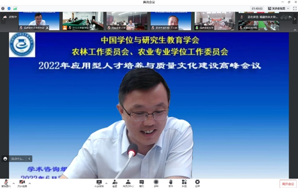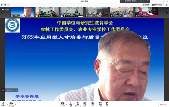 赵忠升副秘书长、郭鑫主任委员、我校邰忠智副校长、研究生院陈曾平院长和我院程月华书记分别致辞,五位领导在致辞中强调了应用型人才培养与质量文化建设的重要性,并对本次会议在疫情防控和学期末工作紧张的状态下按时召开表示祝贺。我校和我院的领导还分别感谢了全国领导专家们对中山大学长期发展和农学院复办建设的大力支持、无私帮助,欢迎大家在方便时多到中山大学的三校区现场考察指导、交流合作。