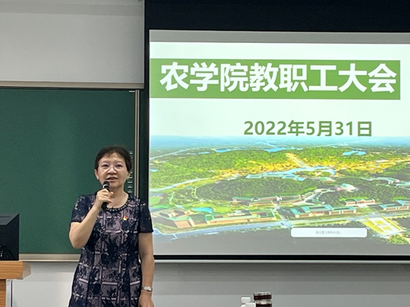 会上,谭金芳院长首先围绕高松校长和其他校领导的大会报告,传达了学校2022年春季工作会议精神。谭院长着重解读了学校在人才培养、师资队伍建设、学部制改革等三方面的任务与要求:一是强调“以学生成长为中心”,遵循“加强基础、促进交叉、尊重选择、卓越教学”的16字方针,激发学生的“思想力、学习力、行动力”。二是深化教师人事制度改革,按照“适度规模、优化结构、注重质量、追求卓越”的基本原则,着力打造高素质教师队伍。三是稳步推进学部制改革,激发学院活力,促进学科交叉。接着,谭院长传达了5月27日部分高校洱海科技大会精神和全国第一届科技小院大赛总决赛情况,鼓励师生积极参与国家重大项目攻坚,助力破解洱海保护与农业高质协同发展难题,建好学院在抗战办学老区设立的乡村振兴工作站和科技小院等平台,把现代农业科技带到乡间地头,集企业与地方的力量,为当地“三农”发展作出应有贡献,并争取早日通过中国科协与农机协会的认证,提升学院和学校的社会影响力。