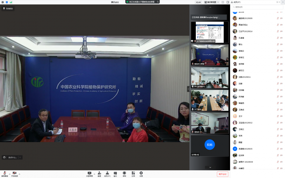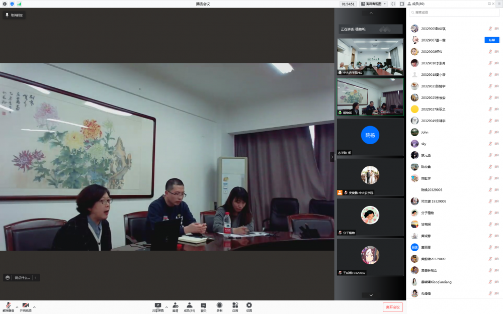 为了贯彻落实全国“两会”精神,担负维护国家粮食安全的职责,推进我院本科生学业深造,加快高层次新农科人才培养,3月11日下午,我院邀请中国科学院分子植物科学卓越创新中心、中国科学院植物研究所、中国农业科学院植物保护研究所三个单位,依托农学院“青禾思政论坛”平台召,在线举办研究生招生政策宣讲会,帮助我院本科生进一步拓宽视野,了解国内农科一流研究机构的前沿动态、研究生招生政策、培养特色等热点问题。三个国家顶尖研究所的研究生负责人、研究生代表;我院党政领导、教师及2019级、2020级本科生90多人,以“线上+线下”结合的方式参加了本次宣讲会。会议由程月华书记策划并主持。