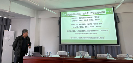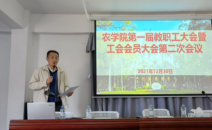 随后,学院副院长兼教代会常委会副主任辛国荣作农学院教代会工作报告。辛院长介绍了农学院第一届教代会常务委员会委员分工,并回顾2021年双代会材料报送、教代会代表团深圳校区调研活动,以及双代会代表参加日常校情通报情况。辛院长详细介绍了教代会代表的提案过程,并表示通过提案,有利于促进学校的改革、发展与稳定,发挥教职工对学校工作实行民主管理和民主监督,完善学校的民主决策体系,维护教职工的合法权益。