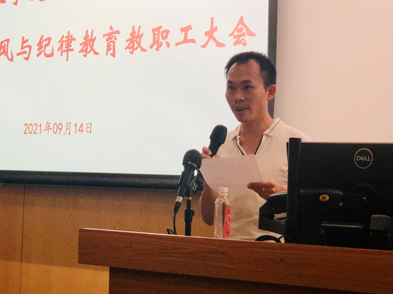 会上,程月华书记首先做了《为学、为事、为人,当好学生成长的引路人——新学期师德师风与纪律教育》的专题报告。程书记首先分享了习近平总书记给全国高校黄大年式教师团队代表回信精神的感悟,介绍了十八大以来党中央对教育工作的部署、对人民教师和师德师风的新要求,以及学校在“明师德要求、强‘四史’教育、学师德楷模、遵师德规范、守师德底线”方面的具体要求。随后,程书记结合学院发展实际,布置了三项重点工作:一是强化学习、深入调研,有针对性、分层次的学习相关规章,研讨学院推进师德师风建设的措施,树牢大局意识、纪律意识、规矩意识。二是明辨隐患、严守规矩,关注意识形态动向,严格遵守相关报批规定,恪尽职守。三是正面宣传、多方引导,继续做好红色院史挖掘,讲好身边的先进典型故事,切实做好党建在团队建设、学生培养等全方位的引领,以赤诚之心、奉献之心、仁爱之心积极投身教育事业,担当起立德树人的神圣使命。