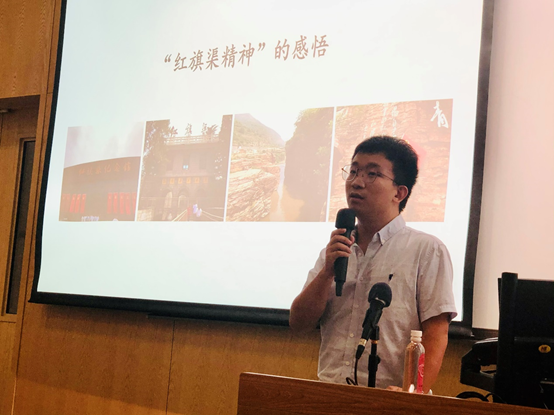 接着,青年教师辅导员陈宏鑫老师和研究生班主任史俊鹏老师分别作为学校2021年“优秀共产党员”和青年骨干教师代表,分享工作感受和红色教育体会。陈宏鑫老师分享了作为青年教师、辅导员和教工党小组组长,在教学科研、党建工作和学生培养等方面的体会,表示会继续以优秀共产党员的标准严格要求自己,为学院发展贡献自己的力量。史俊鹏老师分享了对 “红旗渠精神”的认识和理解,介绍了自己的长辈曾经参与红旗渠建设的感受,表示要发扬“红旗渠”精神,敢做、争做“拓荒牛”,为解决农业“卡脖子”技术贡献才智。