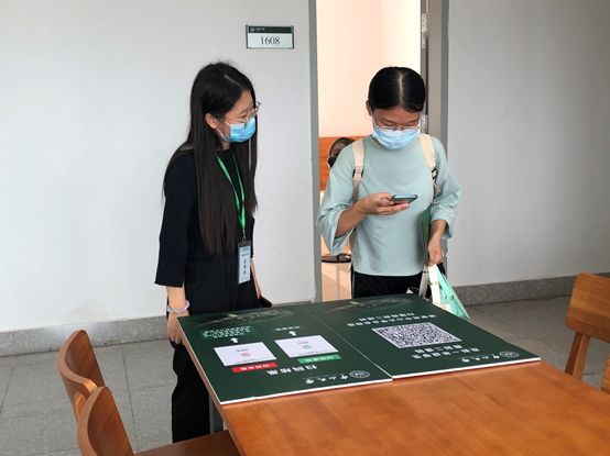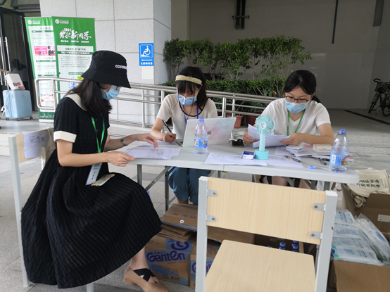 在新生入住的相关楼层,老师和学生志愿者早早在楼层讨论区长木桌上准备好指示牌、二维码、学生证等物品,以最诚挚的祝福欢迎前来报到的新生。志愿者指引新生完成签到、校园卡的领取和激活,并提醒他们按时进行核酸检测和在架空层处购买生活所需物资。在东园四栋17楼的一间宿舍,阳台由于水管堵塞无法排水,志愿者马上帮助新生到一楼宿舍管理处反映问题,带领师傅为该宿舍排查故障,确保新同学顺利入住。