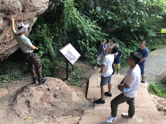 在当地生物学爱好者兼科普导游志愿者邓伟胜先生的陪同下,调研组一行踏查了景区九条研学线路之一的锦石岩线,查看了多变奇特的地形地貌和种类丰富的特有植物。邓先生着重介绍了如丹霞兰、丹霞凤蝶、锚阿波萤叶甲、丹霞山小花苣苔和丹霞堇菜等当地特有物种,以及路线沿途的安全状况。丹霞山奇特的地质地貌景观丰富的和人文生态资源,给调研组一行留下了深刻印象。