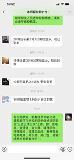 进入假期后,学院及时了解各类同学离校时间和留校安排,配合学校疫情防控和实验室安全管理,动态做好跟踪服务和春节慰问。特别是对于因经济困难等特殊原因留校的本科生,和因专业学习、试验而延后离校的研究生,在学院领导的关心、布置下,党政管理人员会同有关研究生导师,一一了解情况,建立留校学生微信群,及时掌握学生出行信息。根据整个假期在校和延后离校、提早返校等不同情况,分别建档分组,进行精细管理,确保路途安全、在校有序。