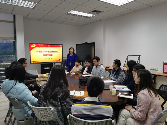 随着学院人才队伍建设力度的不断加大,到岗教师陆续增加。为了引导朝气蓬勃的新到岗教师尽快适应学校教学工作要求,践行“三全育人”的总体要求,12月14日,农学院直属党支部在广州校区东校园召开了推进课程思政教学改革座谈会,学院全体青年教师和党政教辅、实验技术人共20人参加座谈交流。会议由学院程月华书记主持。