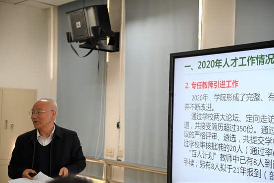 谭金芳院长首先通报了2020年学院人才队伍建设进展情况,以及第四季度学院以人才引进与联合培养、科研合作等为主要内容,分组走访交流情况。他为新到岗的教师们介绍了我院人才队伍建设进展情况和人才工作的主要做法,重点通报了第四季度学院分为北京组、华东组、东北-西南组,在短短的一个月时间内,分别走访了16所国家级科研机构和重点高校,收到了良好的宣传、交流成效。谭院长还分析了当前我院人才工作面临的一些问题,解读了学院尽快扩大师资队伍规模、建好高层次人才团队、着力教师的培养、柔性引进学术带头人等工作设想。