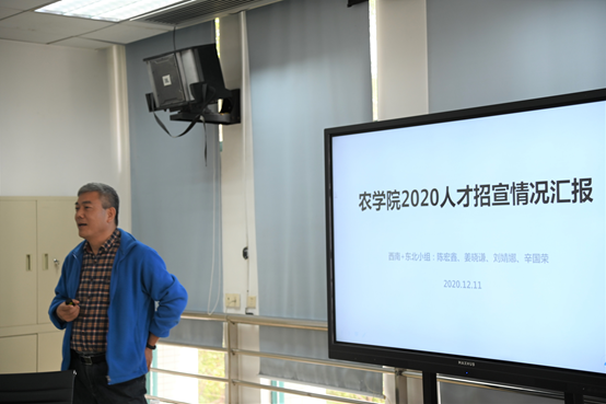 辛国荣副院长代表第三组“西南-东北组”汇报。他介绍说,本组工作行程横跨大半个中国,先后走访了西南大学、吉林大学等4个单位,取得了良好的宣传效果;针对下步招宣工作,提出了“加强前期招聘宣传,做好预热”、“针对需求学科和人群,开展精准宣传”、“加强学院网站教师信息更新”等建议。