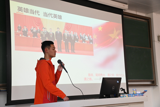 2020级本科生王梓杰同学以习近平总书记在纪念中国人民志愿军抗美援朝出国作战70周年大会上的重要讲话精神为出发点,介绍了抗美援朝的背景和过程,着重了讲述毛岸英、杨根思和黄继光的英雄事迹,并展示了和平时代张国礼等抗疫英雄们对战争岁月英雄精神的传承,表示一定要继承和发扬英雄的精神,雄赳赳、气昂昂,实现既定目标、创造美好生活,告慰先烈、铭记历史。