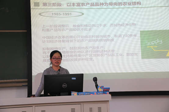 第二小组代表2019级翟悦同学结合专业知识,介绍了70年来中国农业的政策调整和结构变迁,并通过翔实的数据展示了改革开放以来农业发展的成就。翟悦同学表示,学习并总结新中国农业发展史和规律,有助于我们更好地理解“三农”问题,做知农爱农的社会主义接班人。
