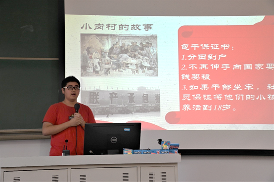 第三小组代表、2019级谢安晟同学作了“从农业政策看改革开放中的农业脉络”的发言,分享学习改革开放史的心得。他以凤阳小岗村的故事引入,详细介绍了改革开放以来的农业政策变迁,展现了中国共产党始终以“以人民为中心”的宗旨。最后,谢安晟同学用“未完待续,展望未来”深情地表达对新时代农业发展的期待,倡议同学们学好专业知识,绘就更美好的未来。
