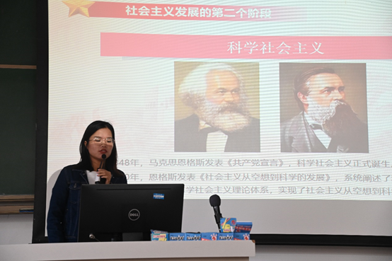 第四小组代表、2019级硕士生杨爽同学分享了学习社会主义发展史的感悟。她从空想社会主义开始,介绍了社会主义发展的六个阶段,通过清晰的时间轴,刻画了马克思主义中国化的伟大历程和中国特色社会主义的伟大实践。她最后强调:“社会主义都是在开拓中前进的。我们必须坚持中国共产党的领导,坚定不移地走社会主义道路,探索和发展符合国情的国家发展道路,为实现中国梦而奋斗!”