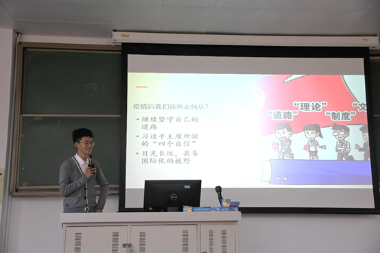 第五组代表、2019级本科生张天旭同学紧扣时事热点,从2020年新冠肺炎疫情中美应对方式的比较研究为切入点,生动展示了习近平总书记在抗击新冠肺炎疫情表彰大会上总结的“生命至上、举国同心、舍生忘死、尊重科学、命运与共”的伟大抗疫精神。他强调了我们既要坚定“四个自信”,走中国特色社会主义道路,又要目光长远,建设人类命运共同体。