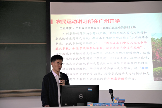 “历史是最好的教科书。对我们共产党人来说,中国革命历史是最好的营养剂。” 第六组代表、2020级研究生国振华同学分享中国共产党历史时,这样引用习近平总书记的话。他通过挖掘广州的“红色基因”,以农民运动讲习所为代表,介绍中国共产党在广州为建设新中国所作的贡献,并梳理了中国共产党对“三农”问题与时俱进的认识历程。