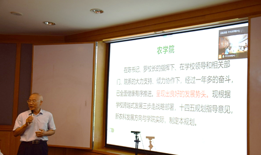 论证会正式开始后,谭金芳院长做了《农学院十四五发展规划》(论证稿)和《农业与乡村振兴战略规划》(论证稿)的情况汇报,全面介绍了学院“十四五”期间在队伍建设、学科建设、科研发展、人才培养等方面的愿景与规划,分析了学院发展面临的机遇与挑战,学院拟重点发展研究方向的国际发展趋势,并就如何与作为“十四五”建设重要内容的“农业与乡村振兴战略”项目对接,做了进一步的具体说明。