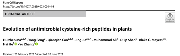 第一篇题目为“Evolution of antimicrobial cysteine-rich peptides in plants”于2023年6月28日在线发表。抗菌肽(Antimicrobial Peptides,AMP)能够保护植物免受病原微生物的侵害。富含半胱氨酸的肽(Cysteine-rich Peptides,CRPs)作为AMP最大的基因家族之一,具有广谱的抗菌活性,但是CRPs在植物基因组中的扩增和进化模式尚不明确。该研究收集了从藻类到双子叶植物在内的240种植物基因组数据,分析CRP拷贝数与植物基因组大小的相关性以及CRP在染色体上的物理分布,研究发现CRP主要通过全基因组复制和局部串联复制进行扩增。通过比较CRP在不同植物谱系中的拷贝数变化,发现CRP拷贝数在不同植物谱系之间差异显著,且与植物生态表型相关,推测这可能是植物面对不断变化的致病环境产生抵抗性的结果。此外,还分析了由不等交换事件产生的独特的双结构域CRPs的演化事件。该研究为CRPs提供了独特的分子演化视角,且对理解其抗菌特性和共生特性提供了重要见解,为开发抗菌肽类植物源农药提供了理论基础。