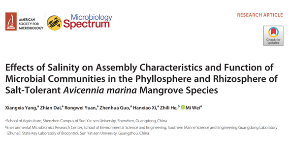2月6日新春伊始,农学院2020级硕士研究生杨想霞在导师魏蜜助理教授的指导下,在国际权威期刊Microbiology Spectrum (IF=9.043;中科院生物学大类一区Top期刊)发表了题为“Effects of Salinity on Assembly Characteristics and Function of Microbial Communities in the Phyllosphere and Rhizosphere of Salt-Tolerant Avicennia marina Mangrove Species”的研究论文。