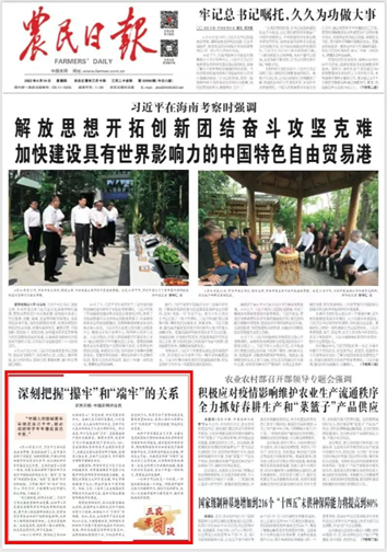 4月10日至13日,习近平总书记在海南省考察,首站就来到了三亚市崖州湾种子实验室,他特别强调,中国人的饭碗要牢牢端在自己手中,就必须把种子牢牢攥在自己手里。总书记语重心长的一席话,形象生动地阐明了攥牢种子与端牢中国饭碗的内在关系:“攥牢”是“端牢”的前提和基础,“端牢”是“攥牢”的目标和检验。只有把“攥牢”和“端牢”内化于心、外化于行,才能确保14亿中国人到点开饭、不饿肚子。