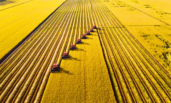 机械化是提升农业综合生产能力的重要措施。作为中国农业现代化的排头兵,黑龙江北大荒集团目前已实现机械化全覆盖,正在积极探索信息化、智能化农业发展的崭新路径。图为2021年8月29日,在北大荒集团江川农场有限公司稻田中,自走式割晒机正进行割晒作业。 人民图片 刘帅冶/摄