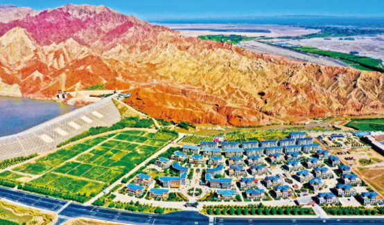 中国要美,农村必须美。近年来,甘肃省张掖市临泽县把全域无垃圾治理和建设美丽乡村、推进乡村振兴结合起来,全民参与着力改善农村环境面貌,提升了群众幸福指数。图为2021年8月24日,丹霞山下的张掖市临泽县倪家营镇梨园新村。 人民图片 王将/摄