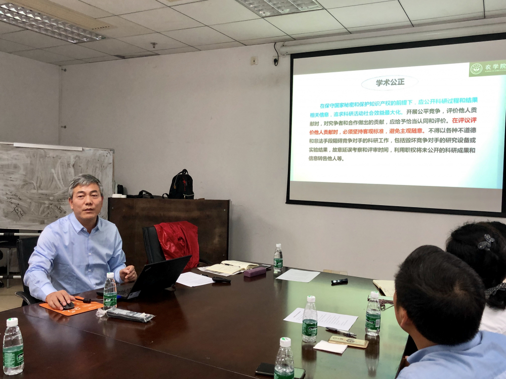 辛国荣副院长在介绍了农学院研究生专业培养工作后,从遵纪守法、求真务实、学术公正、以人为本、恪守诚信五个方面,着重为同学们解读了学术规范基本准则的内涵,并详细介绍了研究生学术论文和学位论文的写作规范。